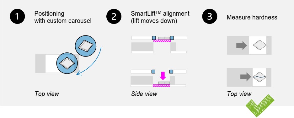 • Mẫu viên được đưa thủ công vào carousel của ST50, sau đó hệ thống sẽ dẫn chúng qua quy trình căn chỉnh lặp lại. Khác với các thiết bị kiểm tra độ cứng thủ công yêu cầu người vận hành giám sát liên tục, ST50 cho phép người dùng tập trung vào các công việc khác trong khi đo, cải thiện cả hiệu suất và tính nhất quán.