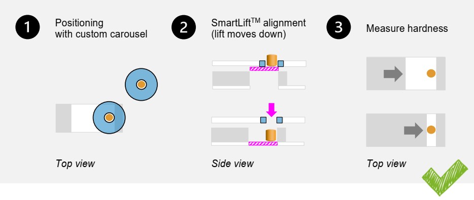 Xử lý viên rất nhỏ (<5 mm) hoặc minitab gây khó khăn trong thử nghiệm bán tự động. Do kích thước nhỏ và thường có dạng hình trụ, các mẫu này khó vận chuyển ổn định. Minitab thường được căn chỉnh theo chiều đứng, yêu cầu thiết kế mâm xoay tùy biến để tránh nghiêng hoặc lăn trước khi đến trạm đo độ cứng. Kiểm soát hướng chính xác giúp giảm nguy cơ đổ và loại bỏ sai lệch dẫn đến kết quả không rõ ràng.