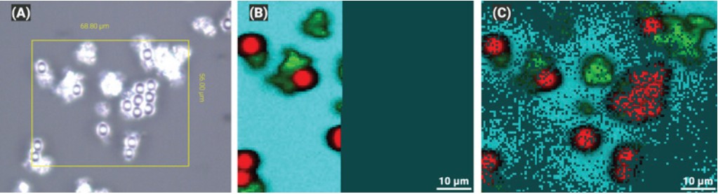 Ảnh 2: Hình ảnh trực quan (A), hình ảnh Raman truyền thống sau 10 phút (B), và hình ảnh Raman Random Walk sau 10 phút (C). Rõ ràng, (C) mang lại một bức tranh đại diện hơn nhiều về mẫu.
