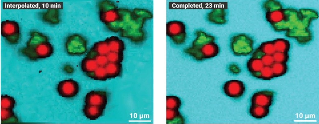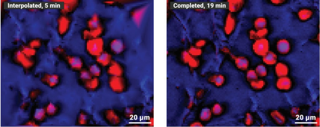 Việc nội suy có thể bật hoặc tắt và được thực hiện trực tiếp khi ảnh được thu nhận, giúp làm rõ trạng thái mẫu và các thành phần bên trong chỉ trong chưa đến một nửa thời gian. Nếu cần, người dùng có thể hoàn tất phép đo, tạo ra một ảnh Raman tương đương với ảnh truyền thống. Bằng cách tiết kiệm hơn một nửa thời gian, việc tìm kiếm các ROI (vùng quan tâm) có thể được tăng tốc đáng kể.